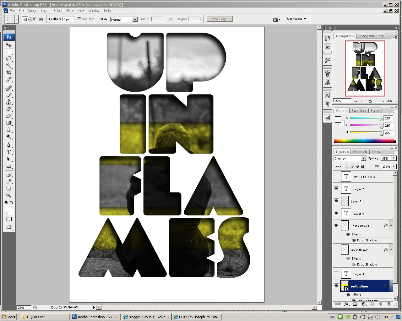 I used Adobe Photoshop CS3 to construct my advertisement for or song of choice - 'Up In Flames'. I decided to use print screens to keep track of my progression so that I can place them onto the blog here and explain the process.
